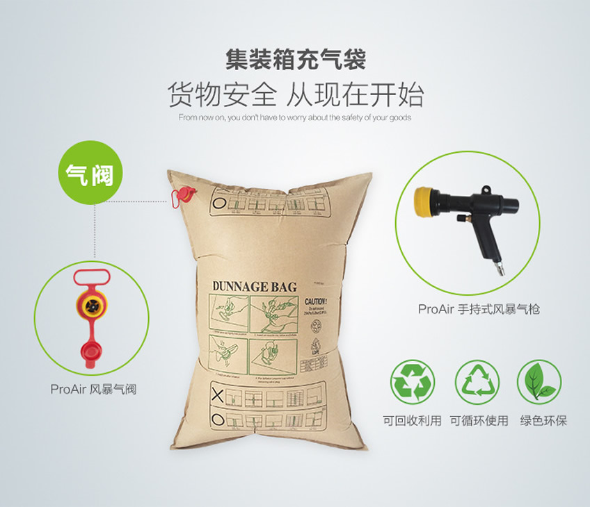 充氣袋,英文名dunnage bag,使用的集裝箱輔助運輸材料。在運輸包裝行業(yè)還有以下別稱:充氣紙袋、集裝箱牛皮紙氣囊、集裝箱緩充氣袋、充氣袋、填充氣袋、集裝箱紙襯袋、集裝箱紙氣袋、集裝箱緩沖氣袋、集裝箱防震緩沖氣袋等等。